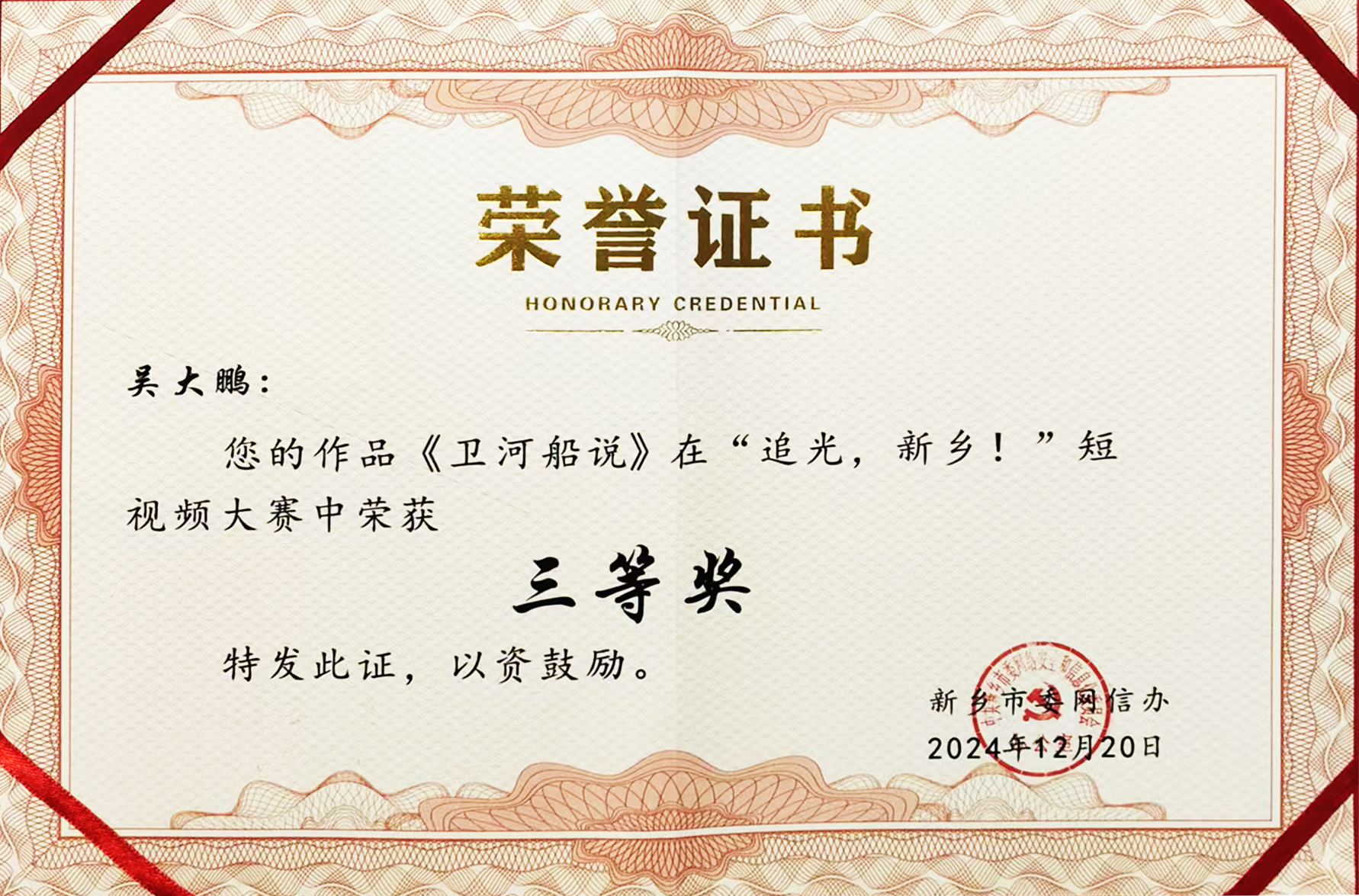 近日,由新乡市委网信办主办的微视频大赛评选结果正式揭晓,新乡视界影视制作有限公司精心创作的微电影《卫河传说》凭借优质的内容呈现与鲜明的地域特色,在全国140多部参赛作品中脱颖而出,成功斩获三等奖荣誉。